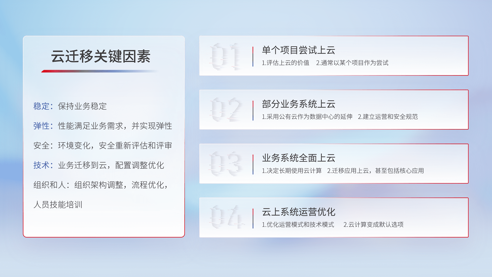 结合实际业务,,从规划设计、、、、云平台选型、、云原生改造、、、、数据迁移、、、、集成交付,,,,迁移全过程为客户识别最佳上云路径,,,做好风险识别管理,,设计网络架构、、身份权限、、安全审计合规、、、操作审计、、、、日志审计、、、、监控告警策略、、、多站点容灾设计等,,,,对云上基础设施进行整体规划,,,提升IT治理水平,,,以满足弹性、、高可用、、、高性能的需求。。。。